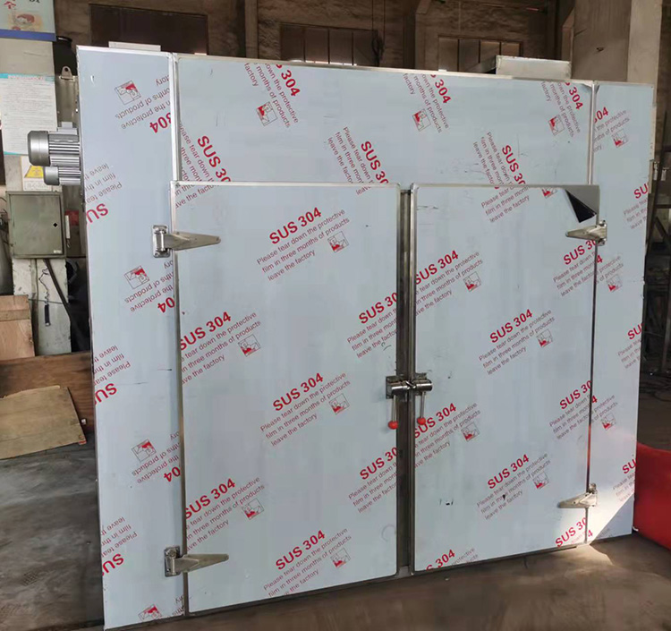 熱風循環烘箱為箱式多門結構,分別配置多臺烘車。熱風循環烘箱的熱源可采用蒸汽加熱或者電加熱。熱風循環烘箱在運行時通過箱頂部的風機將熱風吹入工作室,再由另一側風道返回,構成熱風循環,以保證箱體內溫均勻性。